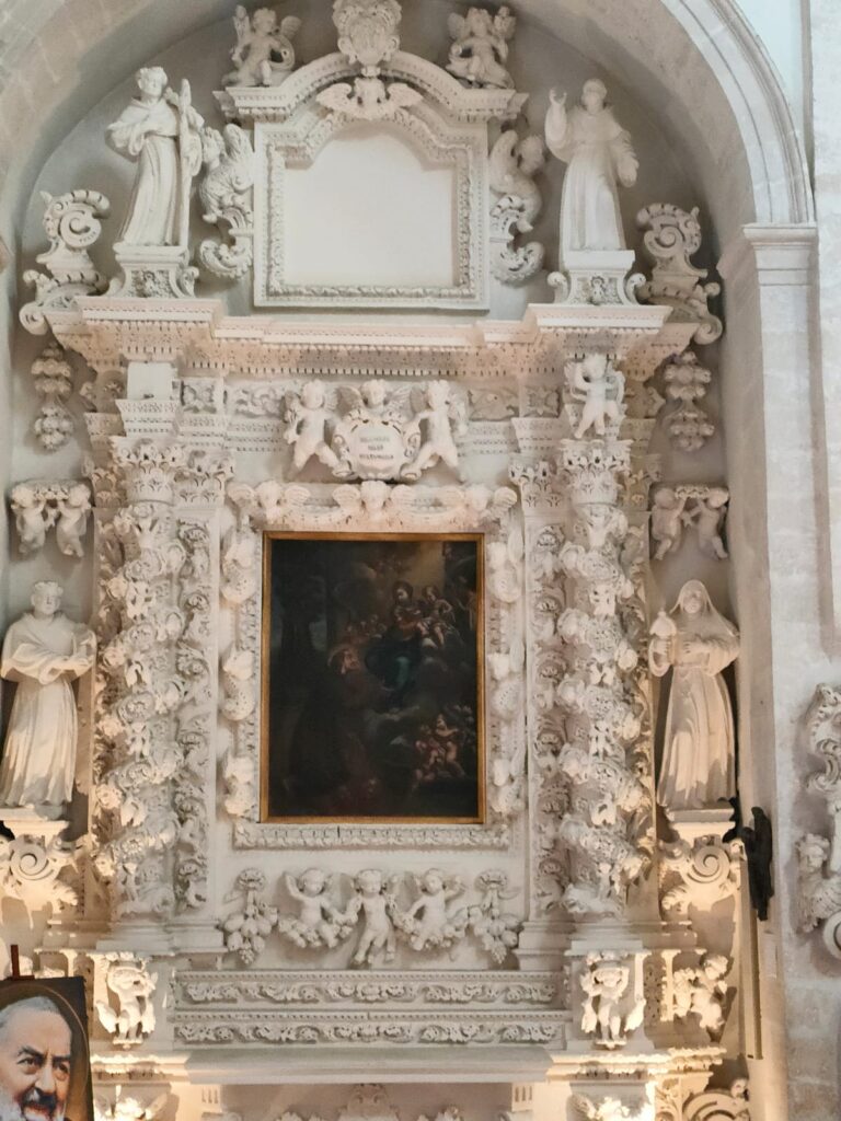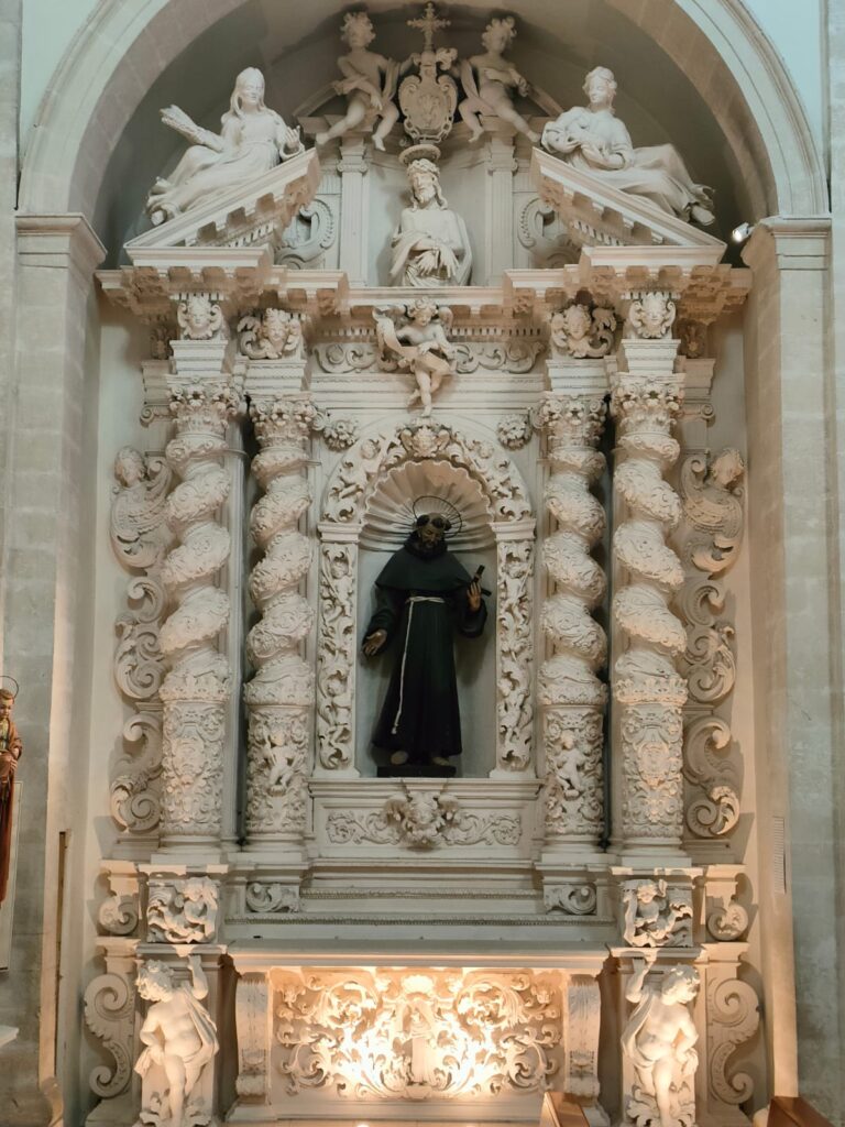 La cappella, ideata e compiuta dallo scultore putignanese don Carlo Intini prima del 1707. Presenta quattro colonne tortili esuberanti di motivi ornamentali, una contro-colonna dorica scannellata e una grande nicchia centrale, con la statua in pietra dipinta di San Francesco d’Assisi, attribuibile allo stesso Intini. La trabeazione ha il timpano spezzato, su cui sono disposte rappresentazioni scultoree: nel mezzo la statua di Cristo in vincoli, liberatore dell’umanità, cinto di corona di spine; sulle cornici oblique due figure di donne distese, simboleggianti il vecchio e il nuovo popolo di Dio, ovvero l’ebraismo e il cristianesimo, ossia a sinistra la Sinagoga e a destra la Chiesa. In alto, al vertice della cappella, due angeli con le insegne della benefattrice Marsilia Fullone. Degno di nota è il paliotto dell’altare: una grande lastra di pietra con elementi floreali in altorilievo, come pure l’immagine di San Francesco e anime purganti con due puttini in alto, che reggono una conchiglia sulla testa del santo. Ai suoi lati, sui basamenti inferiori dell’altare, appaiono due putti che, simili a cariatidi, sostengono l’altare.