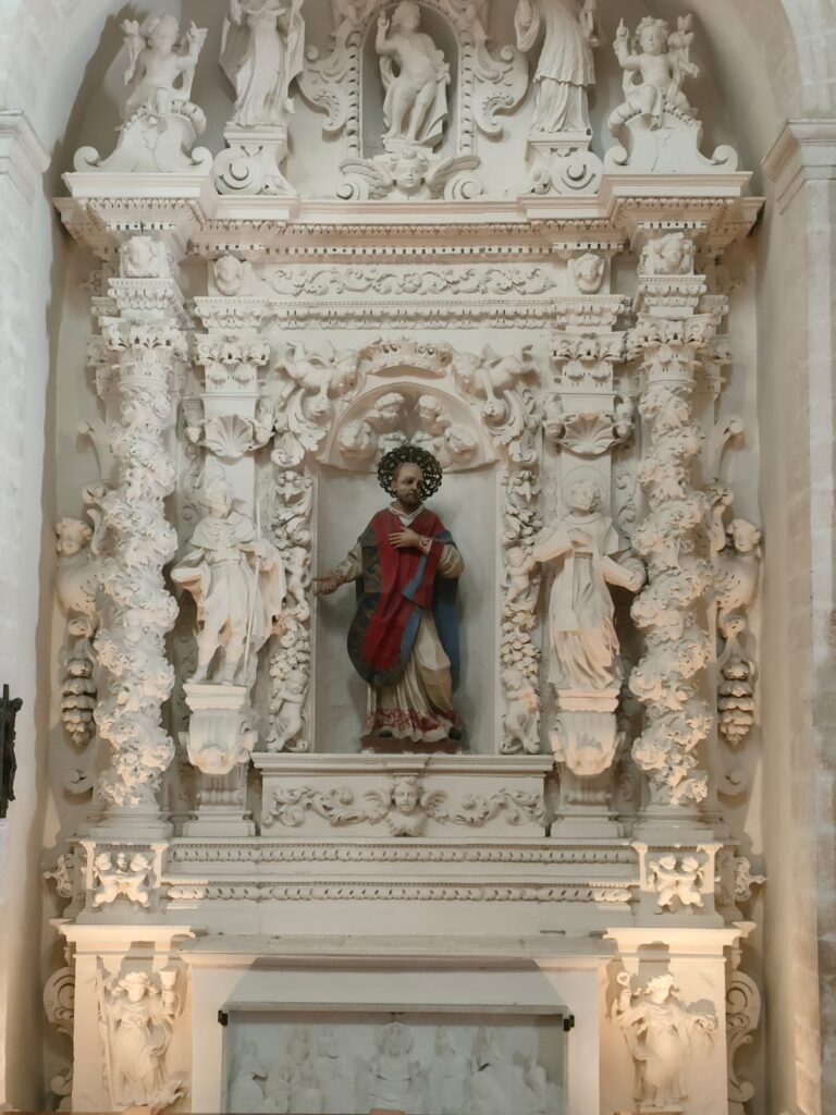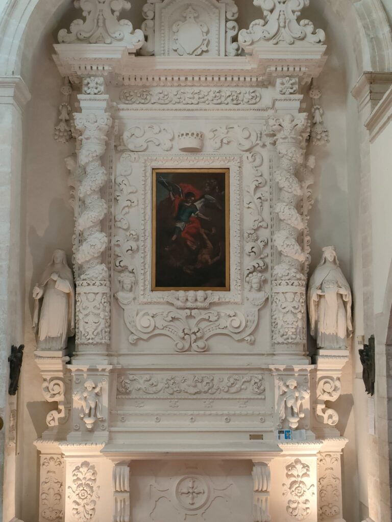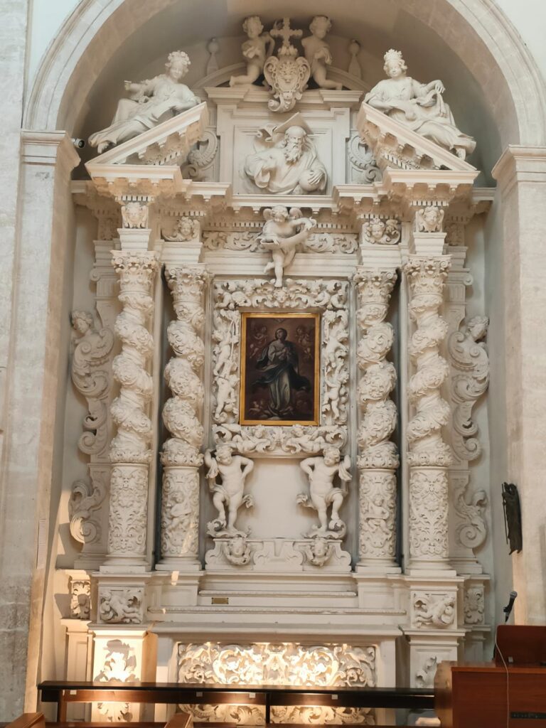 Cappella con ricchezza dei riferimenti biblico-allegorici presenti nello sviluppo della ricchissima cornice in pietra, che ospita una tela raffigurante l’Immacolata, datata alla seconda metà del XVII secolo, di Nicola Gliri di Bitonto (1634-1687). La cornice rappresenta un’autentica catechesi mariana sviluppata con una minuta simbologia tratta dal Cantico dei Cantici e dal libro dell’Apocalisse, riferita alla figura di Maria. Quattro colonne tortili con contro-colonna a pilastro culminano con l’architrave, con il cornicione e con il timpano spezzato, sui cui bordi obliqui s’adagiano due statue, personificazione delle virtù della Castità a sinistra, e della Purità a destra. Nel mezzo in alto c’è la statua del Padre Eterno nelle vesti di un vecchio molto venerando. Sempre in alto due puttini reggono lo stemma di famiglia di Marsilia Fullone (1639-1725): uno scudo recante nel centro un semplice fascio di gigli legati insieme. In posizione centrale spicca la cornice in pietra intagliata, contornata da otto puttini e sorretta in basso da due altri puttini come fossero cariatidi. In alto dalla stessa cornice, dall’architrave e dal fregio si protende la statua di un angelo, recante una fascia senza iscrizione. Nella parte inferiore l’altare presenta in tutta la sua lunghezza un prezioso paliotto in pietra dai molteplici ornamenti floreali e animali con una statuetta dell’Immacolata nel mezzo e lateralmente due angeli che le reggono la corona. Tutti gli elementi sono raffigurati in altorilievo.