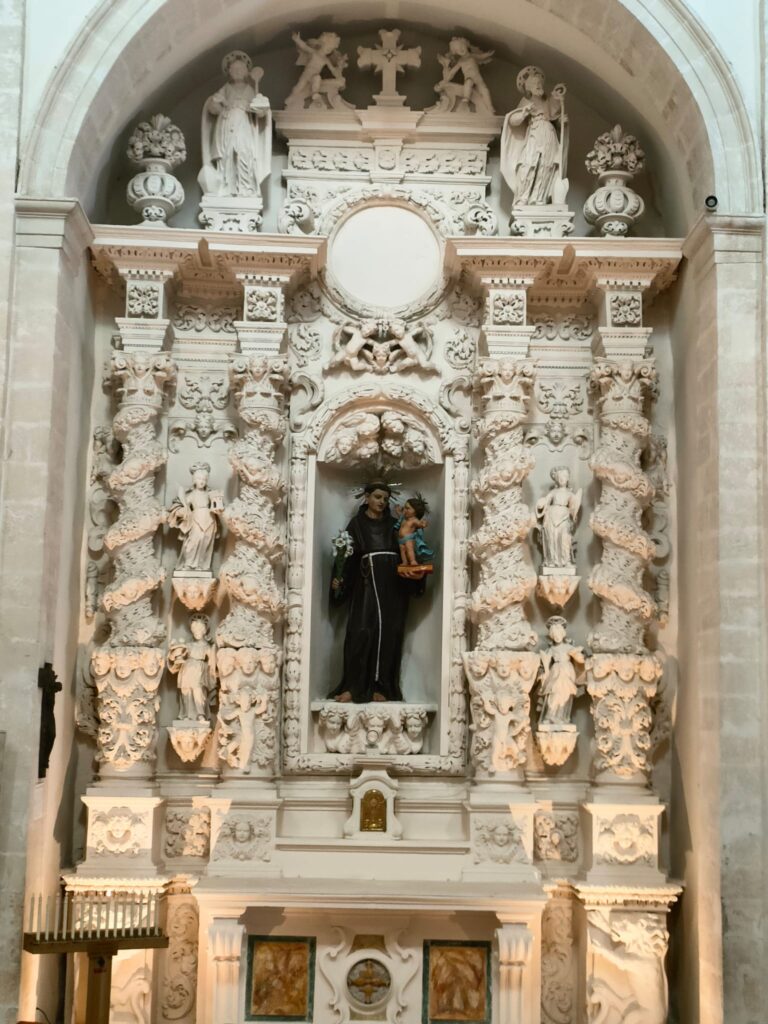 La cappella è strutturata secondo i modi estetici barocchi, tipici dell’ornato della chiesa. Nella fascia mediana, fra gli interstizi delle quattro colonne a spirale disposte a coppia, ci sono quattro piccole statue di sante vergini e di martiri: a sinistra, Santa Barbara in alto e Sant’Agata in basso; a destra, Santa Apollonia in alto e Santa Lucia in basso. Nella parte centrale dell’altare in una nicchia in pietra, in origine dorata, domina la statua di Sant’Antonio di Padova, in pietra dipinta, montata su un piedistallo con tre teste di angeli. Nella parte superiore, oltre all’architrave, al fregio e al cornicione, compaiono vari ornamenti. Rispettivamente a sinistra e a destra, le statue lapidee di San Nicola e di Sant’Oronzo.